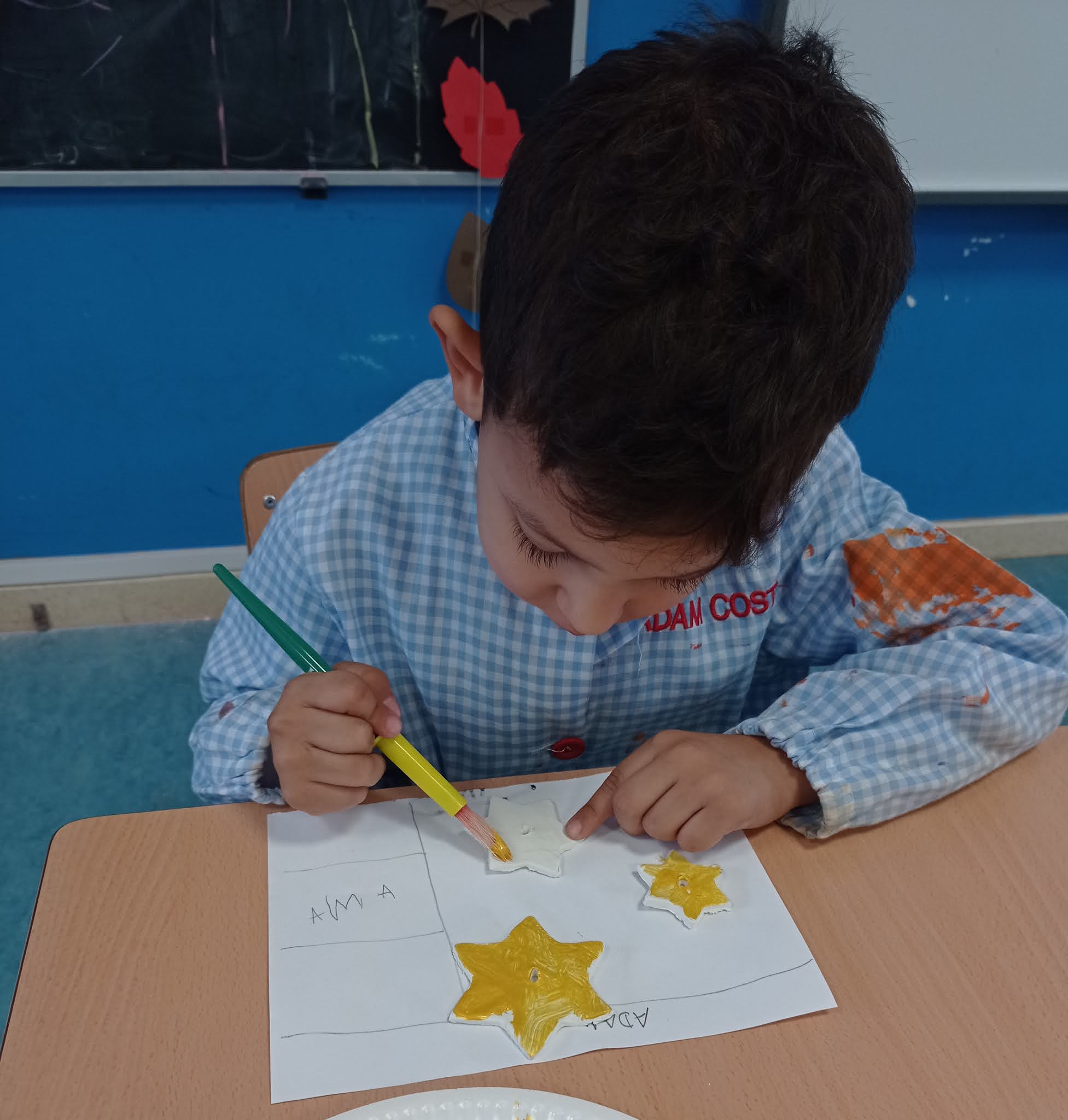 L'endemà vàrem pintar les estrelles per una cara i les bolles. Les vàrem deixar assecar. Per acabar, vàrem pintar l'altra cara de les estrelles.